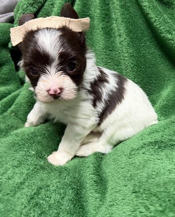 This boy is the chocolate version of a traditional colored Yorkie. He sports a rich chocolate color instead of black; yet keeps the classic tan points.